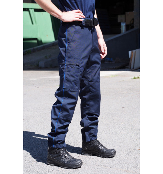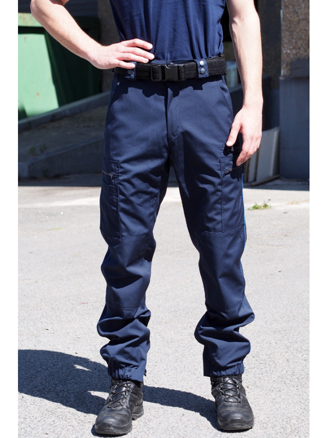 Tissu enduction Téflon® de fabrication française. 67 % Coton - 33 % Polyester. Double poches plaquées sur les cuisses fermées par zip, poches revolver, passants de ceinture fermés par pression, soufflets au bas du pantalon fermés par zip plus élastique. Réglage de la taille par velcro.